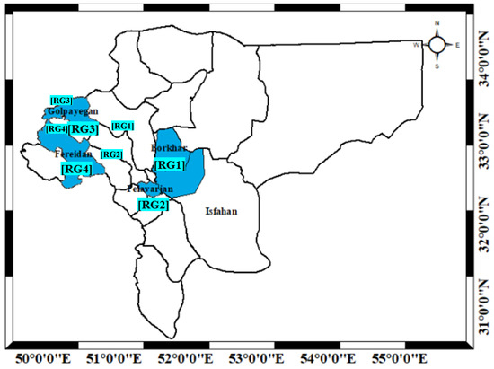 Location of four studied regions (Isfahan-Borkhar, Falavarjan, Golpayegan, and Fereydan) in Isfahan province.
