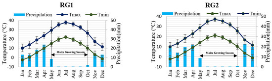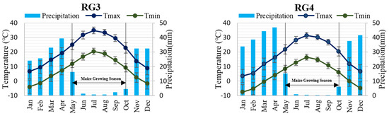 The average precipitation varied between 2.5 and 6.1 mm for RG1, 2.1 and 6.2 mm for RG2, 13.1 and 28.3 mm for RG3, and 22.7 and 42.8 mm for RG4 during the maize growing season for all planting dates. Additionally, with 3.8 and 4.0 mm 15-year average precipitation during the maize growing season in RG1 and RG2, 32% of the studied years were higher, 58% lower, and 10% near the mean precipitation. Although, with an average of 36.9 and 18.8 mm per maize growing season in RG3 and RG4, they were 46%, 33%, and 21%, respectively. Generally, based on 2003–2017 average weather data, RG3 and RG4 had more precipitation (33.1 mm differences between RG1 and RG4, and 18.1 mm between RG3 and RG4), and RG1 and RG2 experienced higher temperatures from planting to harvesting of maize (6.3 °C and 3.6 °C more than the maximum temperature in RG3 and RG4, respectively).