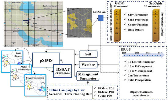 The pSIMS platform was also used to run CERES-Maize over large spatial areas by considering the spatiotemporal variability of soil and weather data and evaluating the effect of management parameter changes on the results and their uncertainty. pSIMS automates the preparation of input data in DSSAT-compliant formats, running crop simulations on a spatial grid, and aggregation of results. This platform simplified these processes by dividing the simulation process into four main steps: gathering and standardizing data, setting up campaigns, running campaigns, and aggregating results to arbitrary scales [44]. Therefore, in our study, this platform was employed to perform regional crop simulations using DSSAT(CERES-Maize) (Version 4.5) across the farmland of a selected area of Isfahan province at a 0.5 arc-minute resolution (∼2 km grid cells).