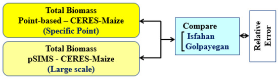 The results of pSIMS-CERES-Maize were compared with those obtained with point-based running using measured soil profiles and historical weather data by Ref. [35]. They conducted a simulation of CERES-Maize by using historical weather data of the nearest stations and 5 to 10 measured soil profile data in Isfahan (RG1) and Golpayegan (RG3) to find the best planting date for a specific point of each studied area (Figure 4).