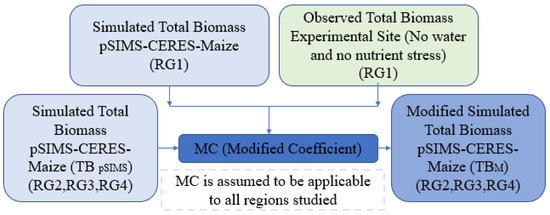 where MC, TBobs, TBpSIMS are modified coefficient, observed total biomass (tons ha−1), and simulated total biomass by pSIMS-CERES-Maize in Isfahan (tons ha−1).