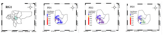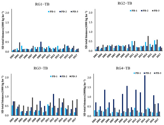 SD amount of total biomass in 15 years (2003–2017) on the planting dates of 18 May (PD1), 18 June (PD2), and 8 July (PD3) in four studied regions (Isfahan-Borkhar (RG1), Falavarjan (RG2), Golpayegan (RG3), and Fereydan (RG4)).
