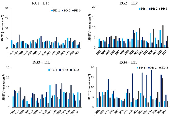 The highest SD of ETc were also 18.7 mm in RG4, 12.34 mm in RG3, 10.96 mm in RG2, and 6.8 mm per season in RG1 during the growing season among three planting dates and 15 studied years (Figure 7). The variability in ETc was found to be also higher in regions and years with a more considerable variation in temperature and probability of precipitation. According to Ref. [53], extreme temperatures are a better predictor of maize yield due to their effect on soil water demand and transpiration rates. Additionally, since temperature and planting dates determine the length of the growing season [54], they could highly affect crop water demand and crop yield during the planting-to-harvest process.