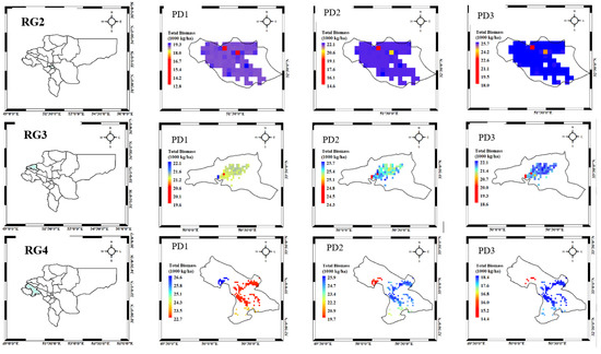 From a temporal perspective, the SD of total biomass across the region varied for different years (Figure 6). The standard deviation of predicted total biomass over 15 years and four studied areas fluctuated between 0.08 and 2.12 tons ha−1, which is almost 0.4 and 8.5 percent of total biomass. The maximum SD of total biomass in RG1 was 0.52 tons ha−1 in 2009, and in RG2 was 0.56 tons ha−1 in 2016. The SD in regions with lower average temperatures and higher precipitation (RG3 and RG4) showed a higher amount and had more considerable variation among 15 years and three planting dates. The largest SD (2.12 tons ha−1) was found in RG4 in PD2 of 2014 among the studied area. In addition, they changed from 0.12 to 1.13 tons ha−1 in RG3 and 0.15 to 2.12 tons ha−1 in RG4 between three planting dates and 15 years. Compared with an arid climate, the Mediterranean climate experiences more variations in specific planting dates and years. Results for two regions with different climates (RG1 and RG4) showed that in RG4, there were maximum SD differences of 0.29 tons ha−1 in PD1, 1.93 tons ha−1 in PD2, and 0.48 tons ha−1 in PD3. While in RG1, it had lower ranges among planting dates, and it was 0.23, 0.44, and 0.35 tons ha−1 in PD1, PD2, and PD3 over 15 years. This could be associated with more water dynamics (seasonal average precipitation and evapotranspiration) during the growing season in Mediterranean regions in some years. Particularly during summer, rainfall could significantly affect mean temperatures [50]. As rainfall and temperature played a significant role in determining maize yield variations in the NCP [51] and precipitation coincided with the later stages of crop growth, this caused extreme variability in temperature and maize yield in the Loess Plateau region in north China [52].