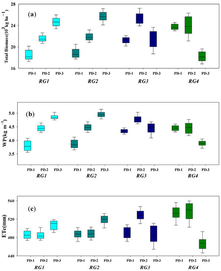 Planting dates and locations had a considerable role in TB, ETc, and WP predictions and their variations (Figure 8 and Figure 9), with different trend patterns across all regions. The simulated average of TB over the studied areas varied from 18.5–23.7 tons ha−1 in PD1, 21.5–25.4 tons ha−1 in PD2, and 17.9–25.6 tons ha−1 in PD3. Among the three planting dates, the highest biomass (25.6 tons ha−1) was in the RG2 (arid climate) and PD3, while the lowest one (17.9 tons ha−1) was in the RG4 (Mediterranean climate) and PD3 (Table 1).