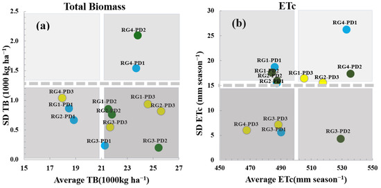 The ideal scenario for decision-making was determined based on the total biomass higher than average with the lowest variation while having a lower average and variability of ETc. Figure 10 shows the average total biomass, ETc, and their standard deviation, RG1 and RG2 on the PD3, and RG3 on the PD2, where located in the bottom right corner of the figure are the best results of total biomass across all regions and among three planting dates (with the highest total biomass and lowest SD simultaneously). In addition, RG4 had a high total biomass on planting dates in May and July, though there was a high variability. For ETc, the best scenario was the one with the minimum average ETc and standard deviation, which is shown in the bottom left corner, and on the PD1 and PD3 in RG3 and the PD3 in RG4, ETc and their SD were the lowest.