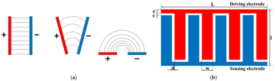 Principle of formation and structure of interdigital capacitive sensor: (a) coplanar electrode formation process diagram; (b) schematic diagram of interdigital capacitance sensor structure.