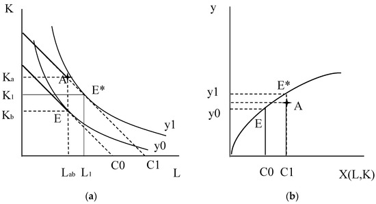 When farmers face an aging internal workforce, other inputs are overused compared to the internal aging inputs. Farmers can achieve production of point A, less than the largest yield y1. And technical efficiency is also less than optimal point E*. Farmers’ first choice is to reduce other inputs to reduce the output to y0, and the technical efficiency is still at the technological frontier (E). The second choice is to increase the input that can replace self-owned labor, such as hired labor or labor-saving biological and mechanical technology. In that case, point A in Figure 1a,b moves to E* point. Therefore, farmers obtain yield y1, and the technical efficiency is still at the technological frontier (E*).