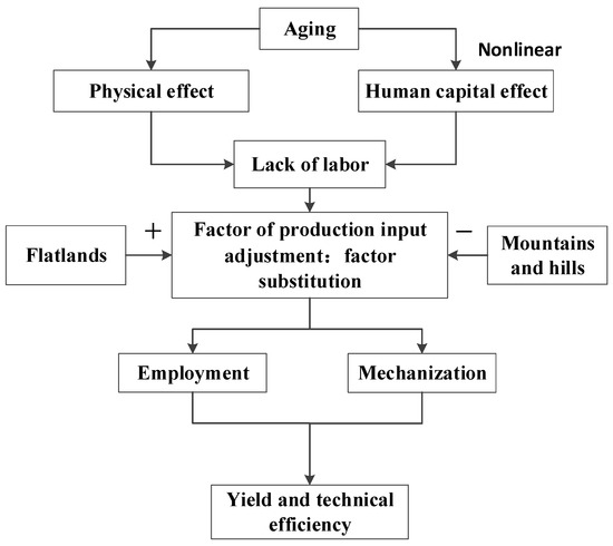 Population aging is a global issue that creates challenges for economic, political, and social trends worldwide [1]. Aging is apparent in developed countries and common in developing countries [2]. In China, people aged 65 and over increased from 7% in 2000 to 12.6% in 2019, indicating a clear aging population trend according to the Statistical Yearbook of China. With industrialization and urbanization, the rural young and middle-aged labor force continues to outflow. The rural population accounted for 39.4% of the total population in 2019, down from 63.8% in 2000. According to the Third National Agricultural Census of the National Bureau of Statistics, in 2016, the proportion of agricultural production and operation personnel aged 55 and above in China was as high as 33.6%, while in the first national agricultural census of 1996, the proportion of agricultural employees aged 51 and above in China was only 18.11%. The aging of the agricultural labor force is an irreversible trend that has become an important issue in China’s economic transformation. It profoundly impacts the supply of the agricultural labor force, inputs of production factors, agricultural production efficiency, and the development of modern agriculture [3,4,5]. Therefore, it is necessary to study the influence mechanism of the aging rural labor force on agricultural production and provide policy suggestions to alleviate the problems caused by aging.