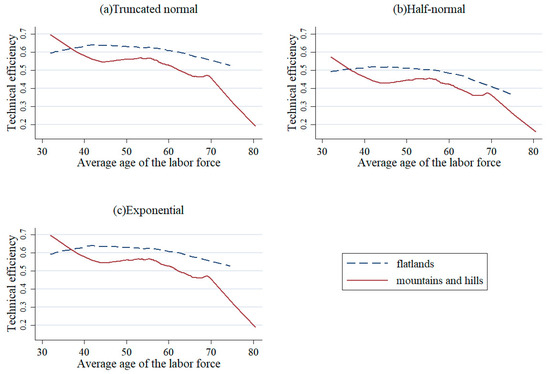 This study used various models to estimate the technical efficiency, as the distributions of have different assumptions, including half-normal [27], exponential [28], truncated normal [29], or gamma [30]. The production function estimation results are presented in Table A1. Table 5 shows the estimated effects of aging on technical efficiency based on truncated regression, with and without considering landform and age squared.