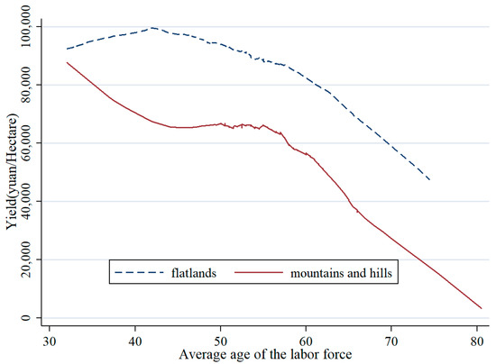Figure 4 shows the relationship between average age and yield in different landforms using local linear regression fitting. The results showed that yield (CNY/hectare) in flatlands rose slowly before the average age of 42 and then descended. However, yield (CNY/hectare) showed a downward trend in mountainous and hilly areas as average age increased, and it declined dramatically after the average age reached about 57. This result intuitively illustrated the heterogeneity of aging’s impacts on yield (CNY/hectare) under different landform conditions.