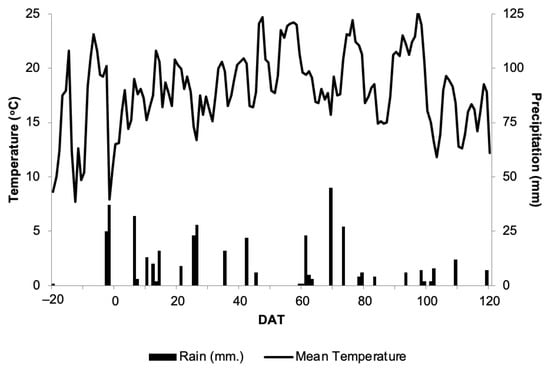 Weather conditions throughout the experiment were sufficient for the release of N from the controlled-release PCU fertilizer. Duration CR® 90 is an EEF that provides a steady release of urea for up to 14 weeks at temperatures of 20 °C when water is not limiting. There was adequate rainfall, so supplemental irrigation was not required, and daily temperatures were sufficiently high to meet the temperature requirement for nutrient release (Figure 1).