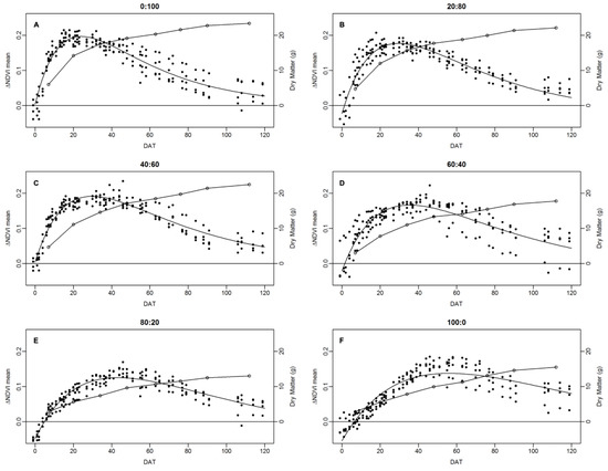The cumulative DMY from each treatment is superimposed on its corresponding pulse-peak curves (Figure 2A–F). DMY data show a similar pattern to the NDVI data, in that greater proportions of urea in the blend led to more growth. The statistical analysis of DMY for specific DATs showed that greater shoot growth was associated with greater amounts of urea in the treatment up to at least 20 DAT; by 34 DAT, that trend had lessened, and by 48 DAT it disappeared completely (Table 2).