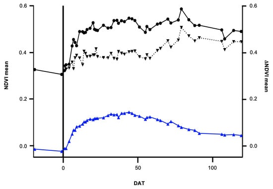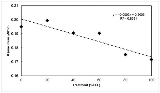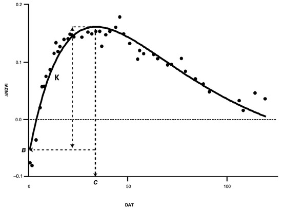 The ∆NDVI values from each treatment were fitted to the curve using a nonlinear least squares (NLS) fitting procedure. The estimates of K and C for each treatment were compared using analyses of variance (ANOVAs) and, where applicable, Tukey’s honestly significant difference (HSD) test, where α = 0.05. Statistical calculations were performed using GraphPad InStat version 3.10, GraphPad Software, San Diego, CA, USA [34].