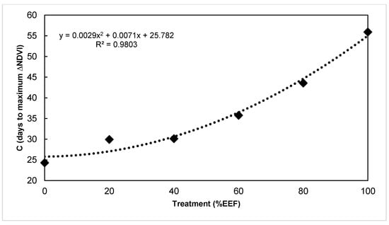 The six fertilizer treatments consisted of ratios of EEF to urea ranging from 100% urea to 100% EEF. Figure 3 shows that the parameter “K” linearly decreased by roughly 1.5% per 10% increase in %EEF in the treatment mix, and Figure 4 shows that the parameter “C” non-linearly increased from 25 to 55 days with an increase in %EEF in the treatment mix from zero to 100%. The above results make sense because the use of EEF can significantly delay the peak NDVI, and slower growth would also slightly reduce max. NDVI.
