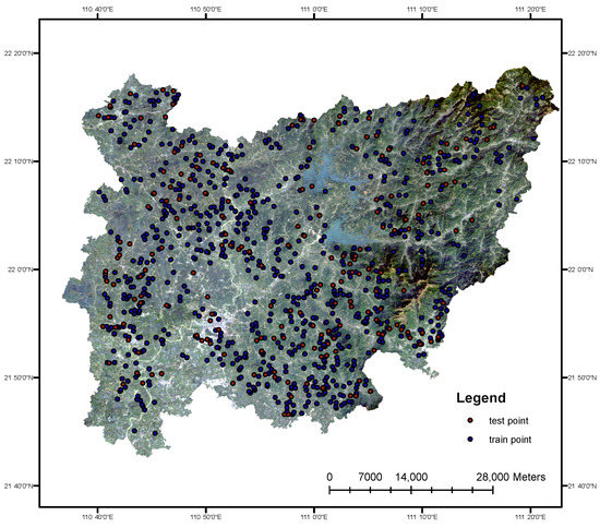 This study is based on a total of 986 soil samples collected from the soil layer of 0–20 cm of the study area using a stratified random sampling approach [27], and their AP content was determined by the Olsen method [28]. Considering the influence of different land use types on the spatial variation of soil fertility, the sampling was stratified according to the land use classification and randomly sampled in different plots. These samples are divided into training and testing sets in an 8:2 ratio, with 789 and 197 samples, respectively. The distribution of the training and testing sample sets is shown in Figure 2.