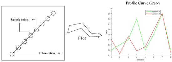 As shown in Figure 5, in the truncation line analysis method, the truncation line is delineated in the continuous space, the variable values on the line are extracted by uniform sampling, and the curve graph of the values of multiple variables on the line is drawn. By plotting the values of multiple variables on the same line, the correlation of different variables at different positions on the line can be visually observed, and this method has been widely used in many studies to analyze the relationship between multiple variables [37,38]. In this study, the correlation, spatial differentiation, and anisotropy of variables were analyzed by selecting truncation lines from different directions.