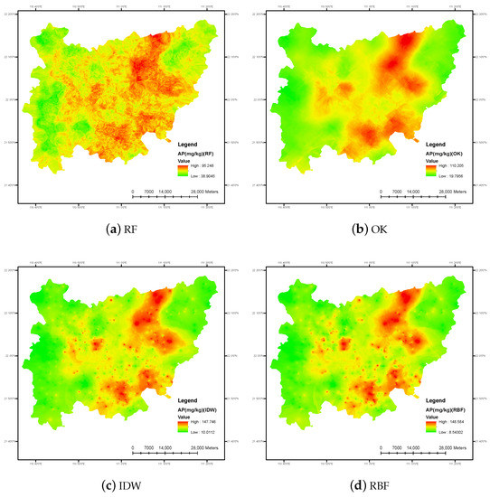 Based on the sampling points and environmental variable data described in Section 2.1, the RF model was employed to predict the AP across the entire study area. To provide a more comprehensive analysis and highlight the differences and advantages of the RF model, three popular spatial interpolation models, including OK, IDW, and RBF, were also utilized to predict AP in the study area under the same condition. The results obtained from these three models were then compared with RF.