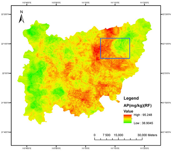 In this study, taking a typical hilly region, i.e., Gaozhou, as an example, an RF model for the digital soil mapping of AP was established and compared with three other popular spatial interpolation models: OK, IDW, and RBF. The results demonstrated that the RF model outperforms the other three interpolation algorithms in terms of interpolation accuracy and expression capability under the same conditions, since it can indirectly learn the spatial structure of the environmental variables. Based on the mapping results of the RF model, the spatial variation characteristics of AP in the study area were analyzed. The results revealed that high- and low-value areas of AP are relatively concentrated. Furthermore, using the RF importance ranking algorithm, the environmental factors shaping the spatial variation pattern of AP were ranked, and the altitude and EVI were identified as the key driving factors.