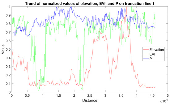 Trend of the normalized values of elevation, EVI, and P on Truncation Line 1.