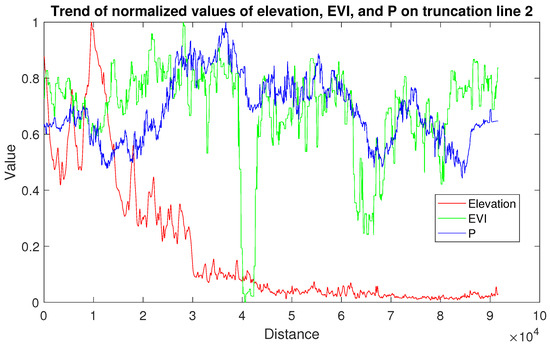 Trend of the normalized values of elevation, EVI, and P on Truncation Line 2.