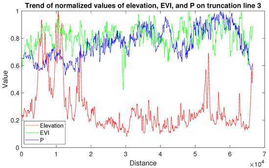 Trend of the normalized values of elevation, EVI, and P on Truncation Line 3.