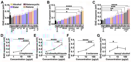 The EAG responses of locust antennae to 18 chemicals. EAG values and bars are mean ± SEM (mV). n = 11–12. Stimulus dose were with 10 µL of 1 µg/µL (A), 10 µg/µL (B) and 100 µg/µL (C). Univariate analysis of variance (ANOVA) and Dunnett’s multiple comparison tests (α = 0.05) were used to compare the difference in EAG responses of the same dose of different odor compounds and CK. CK is mineral oil (solvent) as odor stimulus. 2-I-3-MP: 2-isobutyl-3-methoxy-pyrazine; 2, 5-DP: 2, 5-dimethylpyrazine; 3-HT: 3-heptanone; BB: butyl butyrate; 3-NN: 3-nonanone; 2-IT: 2-isobutylthiazole; 3-OT: 3-octanone; EB: ethyl butyrate; BAC: butyl acetate; PP: pentyl propionate; 2, 4, 5-TT: 2, 4, 5-trimethyl thiazole; PA: pentyl acetate; 2-OT: 2-octanone; 2-HT: 2-heptanone; BAL: benzyl alcohol; T-2-HA: trans-2-hexenyl acetate; HA: hexyl acetate; 4, 5-DT: 4, 5-dimethylthiazole. *, p < 0.05. **, p < 0.01. ***, p < 0.001. ****, p < 0.0001. (D–G): EAG responses of locust antennae to different concentrations of 2-heptanone, 4, 5-dimethylthiazole, 2-octanone, and benzyl alcohol. n = 11–12. Mean EAG responses to the applied doses of the same odor compound were compared by ANOVA and Tukey’s HSD test (mean EAG response <0.05. **, p < 0.01. ***, p < 0.001. ****, p < 0.0001.