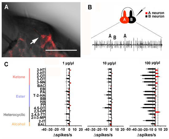 To understand the responses of neurons in trichoid sensilla to these 18 compounds, we first performed in situ hybridization experiments with the locust odorant receptor LmigOR3 and found that LmigOR3 was expressed in neurons housed in trichoid sensilla (Figure 2A). In these trichoid sensilla, neurons A and B were identified according to the amplitude of spontaneous spikes (Figure 2B). An active response evoked by a stimulant was defined to be |∆spikes| greater than twice the mean standard deviation of spikes caused by a control group (PO) [31], and if the emission frequency was greater than 5 spikes per second of the response compared with the control (|∆spikes| > 5), the response of the neuron was excited or inhibited.