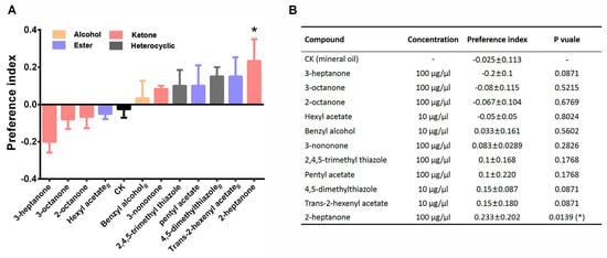 According to the results of EAG and SSR experiments, the preference behavior of the locusts was examined for 11 compounds. As the distance from the source of the odor to the entrance of insect (the length of the single arm of the T-maze device was about 49 cm) would weaken the odor concentration practically perceived by locusts [32], and all compounds just induced low EAG responses at 1 µg/µL, we excluded 1 µg/µL here and only compared 10 µg/µL and 100 µg/µL to make sure the concentration was high enough to be perceived by the locusts. The concentration of 10 µg/µL was closer to that observed in the natural habitat of locusts compared with 100 µg/µL [21]. Therefore, for those (4, 5-dimethylthiazole, benzyl alcohol, hexyl acetate, and trans-2-hexenyl acetate) that could induce strong EAG responses at 10 µg/µL, a concentration of 10 µg/µL was used in subsequent behavioral experiments, and 100 µg/µL was selected for the rest. The results showed that 2-heptanone, a volatile substance derived from the main food source of locusts, significantly attracted locusts (Figure 3).