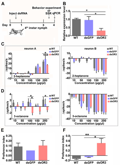 LmigOR3 detects 3-octanone and 2-heptanone; it also mediates aversiveness to 3-octanone in locusts. (A): Timeline of the experiment from dsRNA injection (day 0–1 after the 4th ecdysis), behavioral or SSR experiments (days 3–4), and detection of the dsOR3 interference effect (qPCR on days 4). (B): qPCR experiment showing the effects of injection of OR3 and GFP dsRNA. n = 3. Ordinary one-way ANOVA. Fisher‘s multiple comparisons test. Error bar: S.E.M. *, p < 0.05. (C,D): Comparison of the number of neurons A and B spikes housed on trichoid sensillum expressing LmigOR3 in WT, dsGFP, and dsOR3 locusts in response to 2-heptanone and 3-octanone at different dosages. Ordinary two-way ANOVA. Tukey’s multiple comparisons test. *, p < 0.05; ***, p < 0.001; Error bar: S.E.M. n = 5–9. (E): Behavioral responses of WT, dsGFP, and dsOR3 locusts to 2-heptanone. (F): Behavioral responses of WT, dsGFP, and dsOR3 locusts to 3-octanone. Ordinary one-way ANOVA. Tukey’s multiple comparisons test. *, p < 0.05; **, p < 0.01. Error bar: S.E.M. n = 3–5.