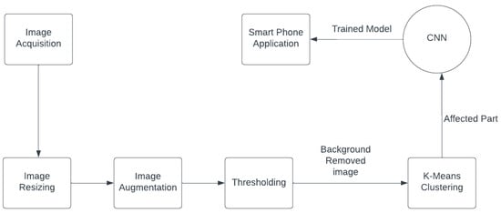 Though the non-affected part of the image is green, the elimination of the green part is necessary to stop misleading for the training of the network. For this reason, thresholding was used for obtaining better performance with the advanced K-means clustering technique as shown in the block diagram of Figure 4.