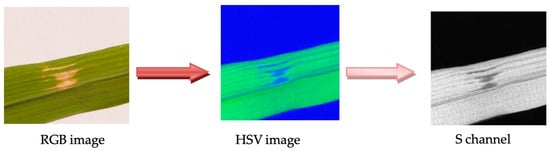 The background of resized image was made white to keep uniform size of the images. According to Figure 3, the RGB image was converted to HSV color space so that the S (saturation) channel was extracted in pre-processing of images. HSV color map was used for color-based segmentation.