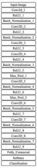 Figure 7 shows the flow diagram of the CNN model, where each block symbolizes each step of the work: According to the CNN architecture, it includes convolution, batch normalization, ReLU, pooling layer, a dense network, a soft-max layer and a classification layer in image processing. Forward propagation is used to get the output from the pooling layer. The kernel and weights are revised according to the backpropagation in the CNN model as shown in Figure 7. The last two layers are the soft-max layer and classification layer which classifies and provide the predicted label of the image.