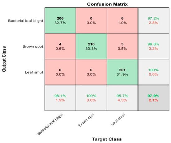 After training the model, the confusion matrix was obtained to classify the diseases of bacterial leaf blight, brown spot and leaf smut as shown in Figure 11. According to the confusion matrix in Figure 11, the classification accuracy was seen as 97.9% whereas the error rate was obtained as 2.1% for rice disease classifications.