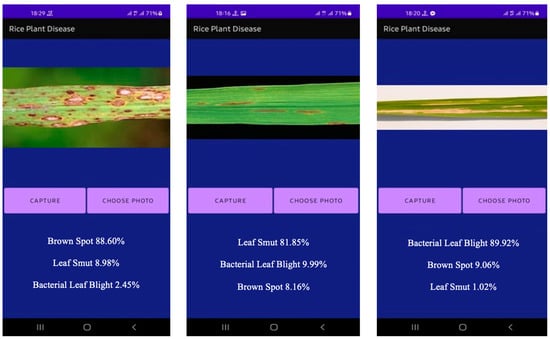 The brown spot-affected image and leaf smut-affected image collected from Internet sources are processed in the mobile app as shown in Figure 14. The mobile app also showed the percentage of possibility of being affected by the disease and classified the diseases with more accuracy through the proposed model.