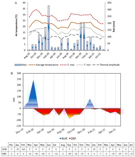 Precipitation, average, maximum, and minimum monthly temperatures, and thermal amplitude of the experimental period (A). Climatic water balance from August 2019 to July 2021: SUR = surplus, DEF = deficit (B).