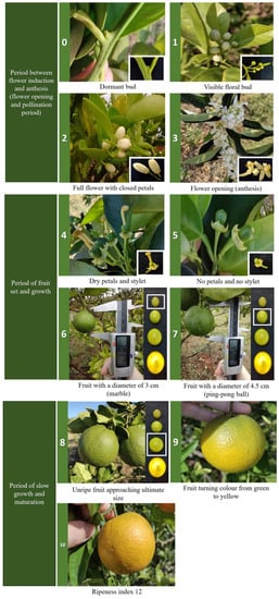 - Agusti, M.; Zaragoza, S.; Bleiholder, H.; Buhr, L.; Hack, H.; Lose, R.; Staub, R. Escala BBCH para la descripición de los estádios fenológicos del desarollo de los agrios (Gén. Citrus). Levante Agrícola Rev. Int. Cítricos 1995, 3, 189–199. Available online: https://redivia.gva.es/handle/20.500.11939/7875 (accessed on 3 July 2021).