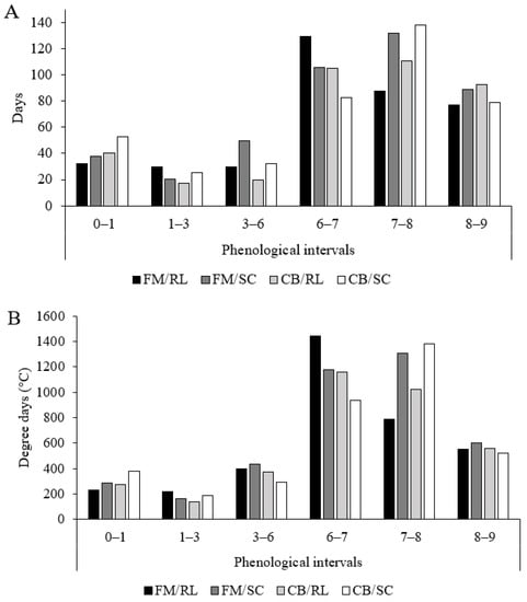 Phenological intervals of the scion/rootstock combinations measured in days (A) and degree-days (B). FM = ‘Folha Murcha’; CB = ‘Charmute de Brotas’; RL: ‘Rangpur’ lime; SC: ‘Swingle’ citrumelo.