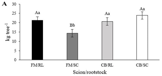 Selecting proper rootstock can provide important improvements to the scion [], such as juvenile period reduction, homogeneous tree architecture, pest and disease protection, water and nutrient absorption, tolerance to abiotic stress [] and increased yield. Fruit size, juice quality, fruit ripening duration, sugar and acid content, fruit skin color, and fruit thickness are also influenced by rootstocks [,].