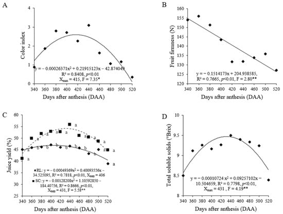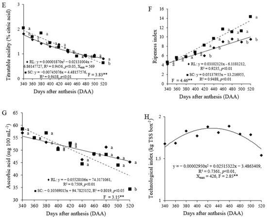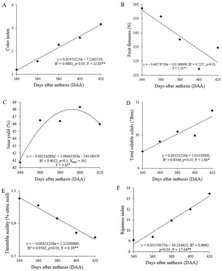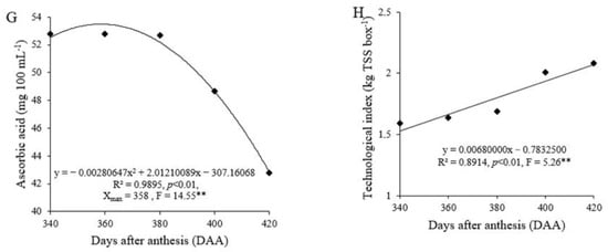 The reduction in TSS content observed in the days after the point of maximum value may be related to the dilution of the juice present in the fruits due to the increase in rainfall that occurred during the period []. Similar results were reported by Stenzel et al. [] in their evaluation of the ripening of FM fruits on different rootstocks; they verified a quadratic decrease in the citric acid content of the fruits. This can be explained by the conversion of organic acids into sugars or their use in respiratory processes [].