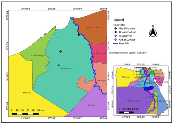 Study locations (municipal divisions) within El Beheira Governate in northern Egypt. Al Mahmoudiya, Kafr El Dawar, and Abu El Matamir Divisions represent the “old lands”, while El Nubariyah Division represents the “new lands”.