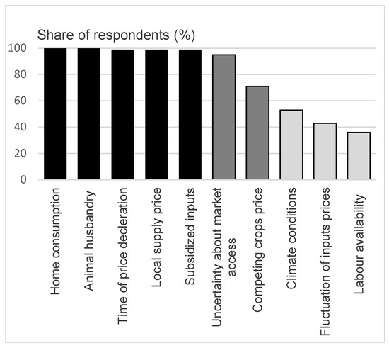 Both results from the open interviews and questionnaire-based interviews determined ten key factors influencing the decision of smallholders to grow wheat. The influence of these factors was evaluated and ranked based on smallholders’ perspectives, as shown in Figure 2.