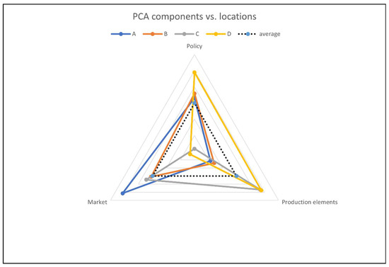 The second component (PC2), “production elements”, showed significant differences among the four divisions. However, there were no significant differences between Abo El Matamir (“C”), and El Nubariyah (“D”). Additionally, there were no significant differences between El Mahmoudiya (rural–moist “A”) and Kafr El Dawar (urban–moist “B”) (Table 3). In the Abo El Matamir division (“C”), the production elements factor (PC2) was considered the most significant driver. However, in El Mahmoudiya, PC2 was found to be the least significant driver (Figure 3).