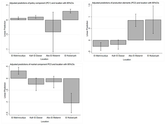 Lastly, the market factor (PC3) showed significant differences among all four divisions except between Abo El Matamir (“C”) and Kafr El Dawar (“B”) (Table 4). In El Mahmoudiya (“A”), the market factor was found to be the most significant factor, while it was the least significant factor in El Nubariyah (“D”) (Figure 3).