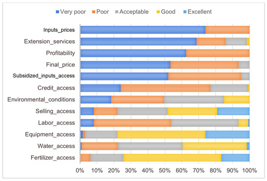 The second part of the primary quantitative data collection was aimed at understanding smallholders’ perceptions of factors affecting wheat production. Twelve variables were identified from the open interviews and the FDGs, namely: access to subsidized inputs, access to credit, access to agriculture extension services, access to the market, the availability of farm equipment, the availability of agrochemicals, the availability of labor, the availability of water, environmental conditions, input prices, wheat supply prices, and general profitability. Smallholders were asked to rate these variables on a five-point Likert scale from very poor = 1, poor = 2, acceptable = 3, good = 4, to excellent = 5.