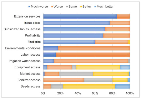 The data show that wheat-growing smallholders perceive a significant deterioration of the extension services, the prices for inputs, the access to subsidized inputs, the profitability and the final price between 2000 and 2020. However, interestingly, they also stated that the access to equipment and the access to seeds improved in this period. Market access and fertilizer access were also seen as being either “the same”, “better” or “much better” compared to 2000 for the majority of the smallholders (Figure 6).