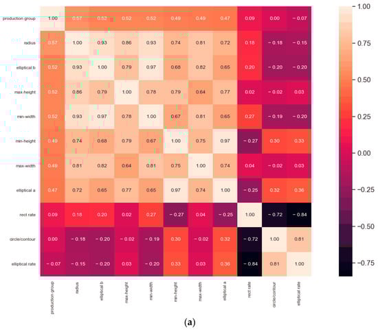 Figure 8a shows the correlation heat map of the data extracted based on the SOLOv2 mask, and Figure 8b shows the correlation heat map of the data extracted based on the Mask R-CNN mask. The color from dark to light indicates the correlation from low to high. The analysis shows that the Pearson correlation coefficients of the circumscribed regular rectangle width and height (max-width, max-height), the minimum circumscribed rectangle width and height (min-width, min-height), the circumcircle radius (radius), the fitted elliptical length of major axis and minor axis (elliptical a, elliptical b), and the production group are 0.49/0.51, 0.52/0.47, 0.52/0.60, 0.49/0.45, 0.57/0.58, 0.47/0.43, and 0.52/0.60, respectively, which are correlated between 0.4 and 0.6. The Pearson correlation coefficients of the minimum circumscribed rectangle aspect ratio (rect rate), the circumscribed circle area to contour area ratio (circle/contour), and the fitted elliptical major-to-minor axis ratio (elliptical rate) with the production group are 0.09/0.21, 0.00/−0.16, and −0.07/−0.27, respectively, with absolute values in the range 0.0–0.4. The absolute values of the correlation coefficients were found to be 0–0.3 (0 is not included) for weak correlation, 0.3–0.5 (0.3 is not included) for low correlation, 0.5–0.8 (0.5 is not included) for moderate correlation, and 0.8–1.0 (0.8 is not included) for high correlation. Therefore, to reduce the complexity of the neural network algorithm and improve the classification accuracy and efficiency, the weakly correlated features were excluded.