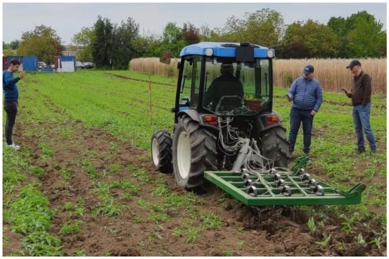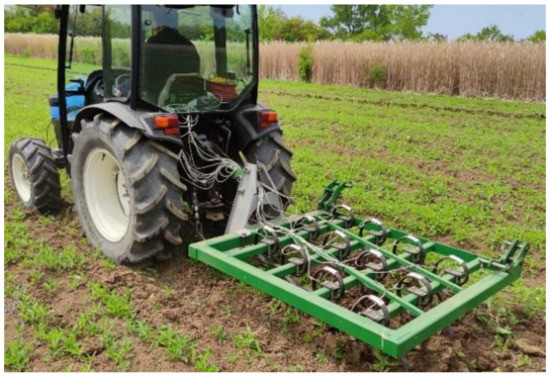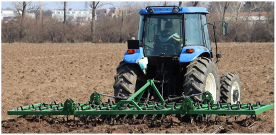 Research on the MCLS soil tillage machine (a variant with a working width of 1 m) is the subject of this article. The presented results describe the experiments and the statistical processing of the experimental data. The MCLS complex cultivator was initially conceived, designed, and realised to facilitate research in the field of soil processing [39,40]. The machine was designed for three working widths: 4 m and 2 m (with an 80 HP tractor) and 1 m (for a 45 HP tractor). Additionally, the supporting structure can support the installation of 5–10 types of working bodies to make comparative estimates as complete as possible. After conception, design, and execution, the idea of using the machine in farm operations also appeared. Thus, the machine can be used simultaneously for farm applications and research. Images from the experimental activity with the MCLS machine in all working variants are given in Figure 1, Figure 2, Figure 3 and Figure 4.