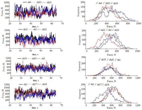 In Figure 7 in the column of graphs on the left, the temporal variations of the forces that load the supports of the twelve working bodies of the version with a working width of 1 m of the MCLS are shown. Additionally, in Figure 7, the histogram of the frequencies of the force values is represented in the right column. The polygon of frequencies is built using the histograms. When the number of classes in the histograms becomes very large (theoretically to infinity), the frequency polygon tends to reflect the real distribution density of each force. The frequency histograms are constructed with 64 classes using the formula of Mosteller and Tukey [45]. We took into account the length of the data strings obtained experimentally in calculating the number of classes in the histograms.