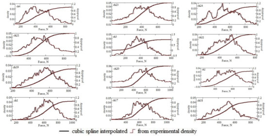 The probability densities calculated as shown above do not resemble those found in statistics books or in articles in which the experimental results are approximated, by hypothesis, with one of the classical statistical distributions (normal, exponential, Student, Fischer, etc.). Probability distributions differ from the statistical densities with which experimental curves are usually approximated. Precision is lost by approximating with the classical statistical distributions of the probability densities, and we cannot precisely estimate the local error in relation to the experimental data. For this reason, we preferred, considering our goals, to interpolate the empirical probability densities through cubic spline functions since we wanted maximum precision and were not interested in using the results in immediate theoretic models. Regarding the probability curves, they have shapes very similar to the classical ones, but for the same reasons, we proceeded with the probabilities by interpolating with spline functions. In Figure 8, the experimental curves interpolated by spline functions are given in each graph for the twelve series of 4000 numerical data points.